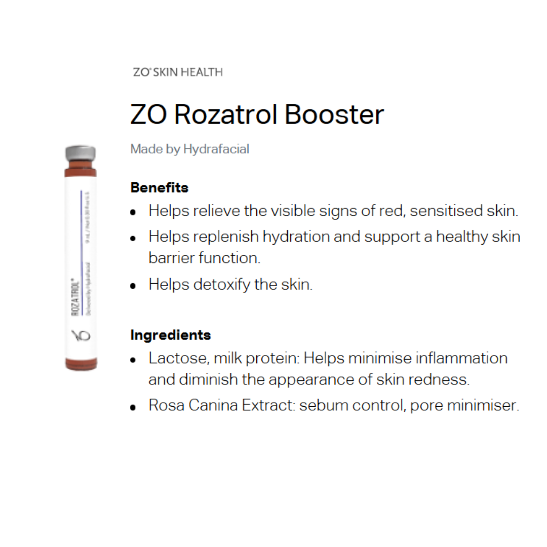 Gentle exfoliation and soothing serums like the Rozatrol Booster help calm redness and inflammation, making HydraFacial suitable for sensitive skin types.The Rozatrol booster is specifically designed to help manage rosacea and reduce its visible symptoms. It contains a blend of anti-inflammatory and antioxidant ingredients that soothe redness, calm irritation, and minimize flushing. Additionally, it targets excess oil production, which can contribute to inflammation, and promotes a healthier skin barrier to improve overall skin resilience.